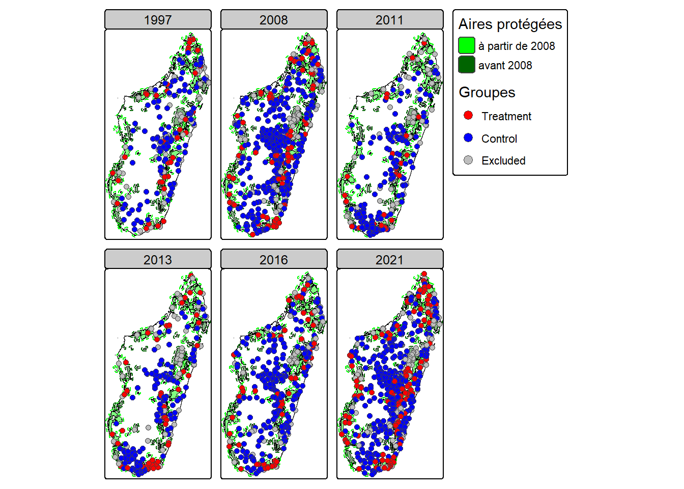 Groupe de traitement: Ménages localisées dans les clusters à moins de 10 km des aires protégées créées à partir de 2008 dans les zones rurales