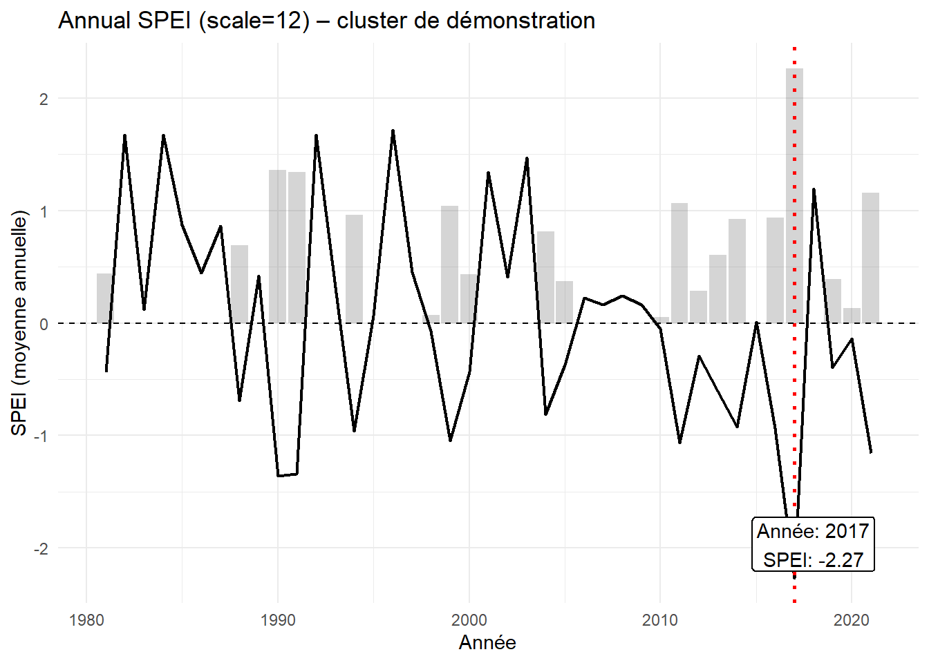 On observe qu’entre 1980 et 2000, la majorité des années a un SPEI supérieur à 0, correspondant à des conditions normales ou légèrement humides, avec peu d’épisodes de sécheresse significative selon la classification de Mckee et al (1993?). En revanche, à partir des années 2004, on obtient des SPEI inférieur à 0, marquant une augmentation de la fréquence des épisodes de sécheresse. En 2017, le SPEI a une valeur particulièrement basse (SPEI = -2.40012658), qui d’après la classification de Vicente-Serrano et al. (2010?) caractérise une sécheresse très sévère.