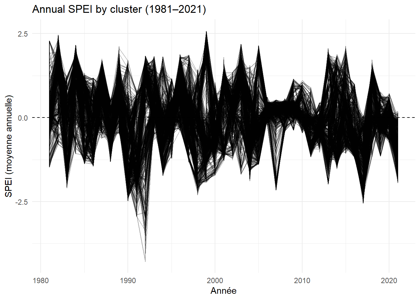 Nous avons chargé le dataframe contenant les données sur la précipitation, la température minimale et la température maximale pour chaque clusters. A partir des coordonnées géométriques de chaque clusters, nous calculons la latitude, qui nous servira de base de calcul pour estimer l’évapotranspiration potentielle (PET). Le calcul de la latitude garantira que l’estimation du PET est spécifique aux conditions géographiques locales. Nous récupérons ensuite les séries temporelles mensuelles des variables climatiques de chaque cluster: température minimale (tmin), température maximale (tmax), précipitation (prec). A travers la formule de Hargreaves, nous estimons le PET et le water balance (c’est-à-dire la différence entre la précipitation et le PET). Le water balance est converti en série temporelle, à partir de laquelle l’indice SPEI est estimé sur une échelle de 12 mois, en utilisant une période de référence de 1981 à 2021. Pour une analyse plus globale, on agrège les résultats à l’échelle annuelle en calculant la moyenne annuelle des valeurs de SPEI par année pour chaque cluster.