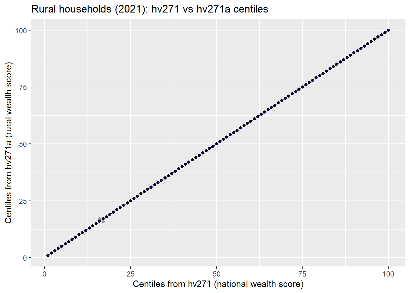 The results show near-perfect agreement between the two indices, confirming that the national wealth index can be used directly to reconstruct rural centiles, without loss of consistency. This greatly simplifies the treatment of earlier surveys (MIS 2011, 2013, 2016), where domain-specific wealth scores are not provided.