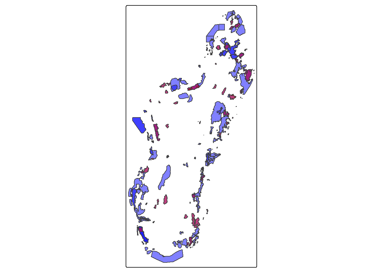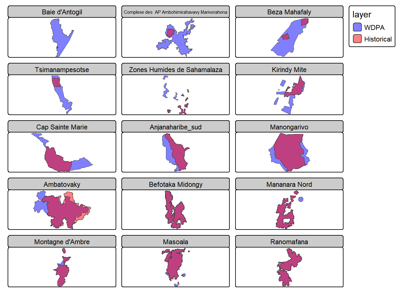 # We load the required librarieslibrary(tidyverse)library(sf)library(tmap)library(wdpar)library(gt)# Chargement des données WDPAwdpa_mdg <-wdpa_read("data/WDPA_WDOECM_Nov2025_Public_MDG.zip")# The dataset seems to have some issues with missing .shx files# We set an environment variable to restore themSys.setenv(SHAPE_RESTORE_SHX ="YES")# Load the historical borders datasetmnp_hist <-st_read("data/no_id/allAP_ap2000_2010_Merge_Lab/allAP_ap2000_2010_Merge_Lab.shp",quiet =TRUE) |>st_set_crs(29701) |>st_transform(st_crs(wdpa_mdg))tm_shape(wdpa_mdg) +tm_polygons(fill ="blue", alpha =0.5) +tm_shape(mnp_hist) +tm_polygons(fill ="red", alpha =0.5)