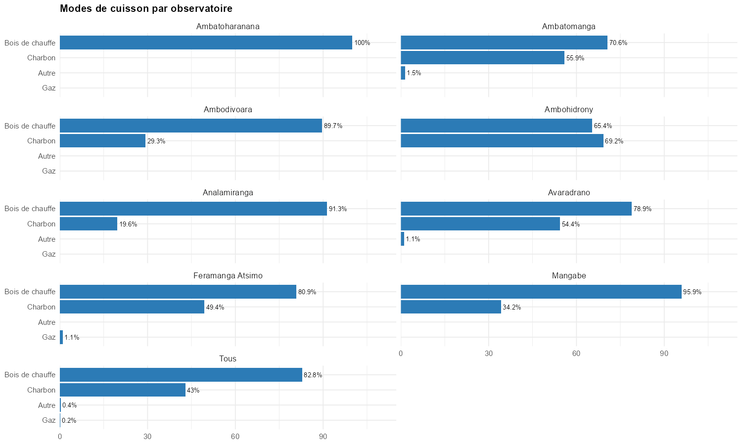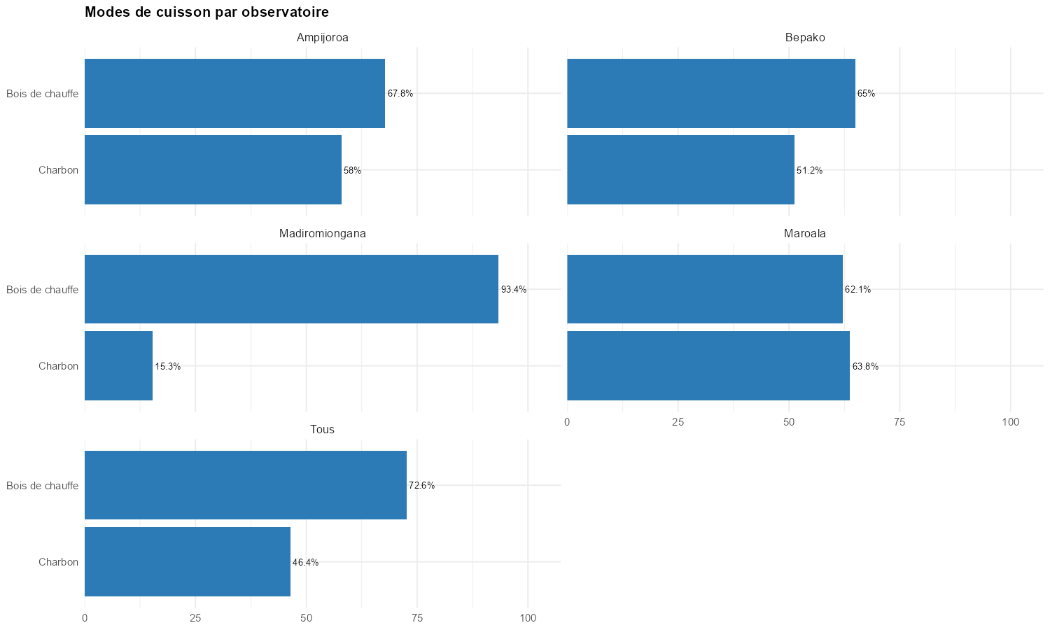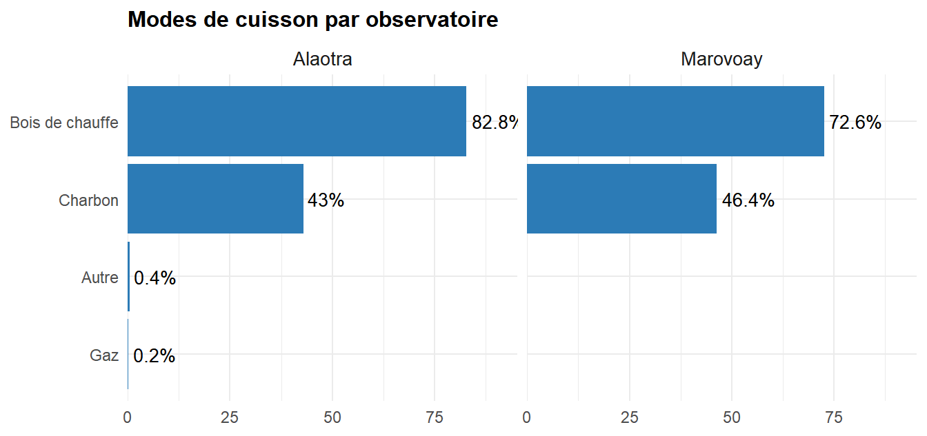 La quasi-totalité des ménages ruraux malgaches dépendent de la biomasse pour la cuisson. La nature exacte du combustible utilisé (bois, charbon de bois) varie selon la disponibilité locale des ressources forestières.