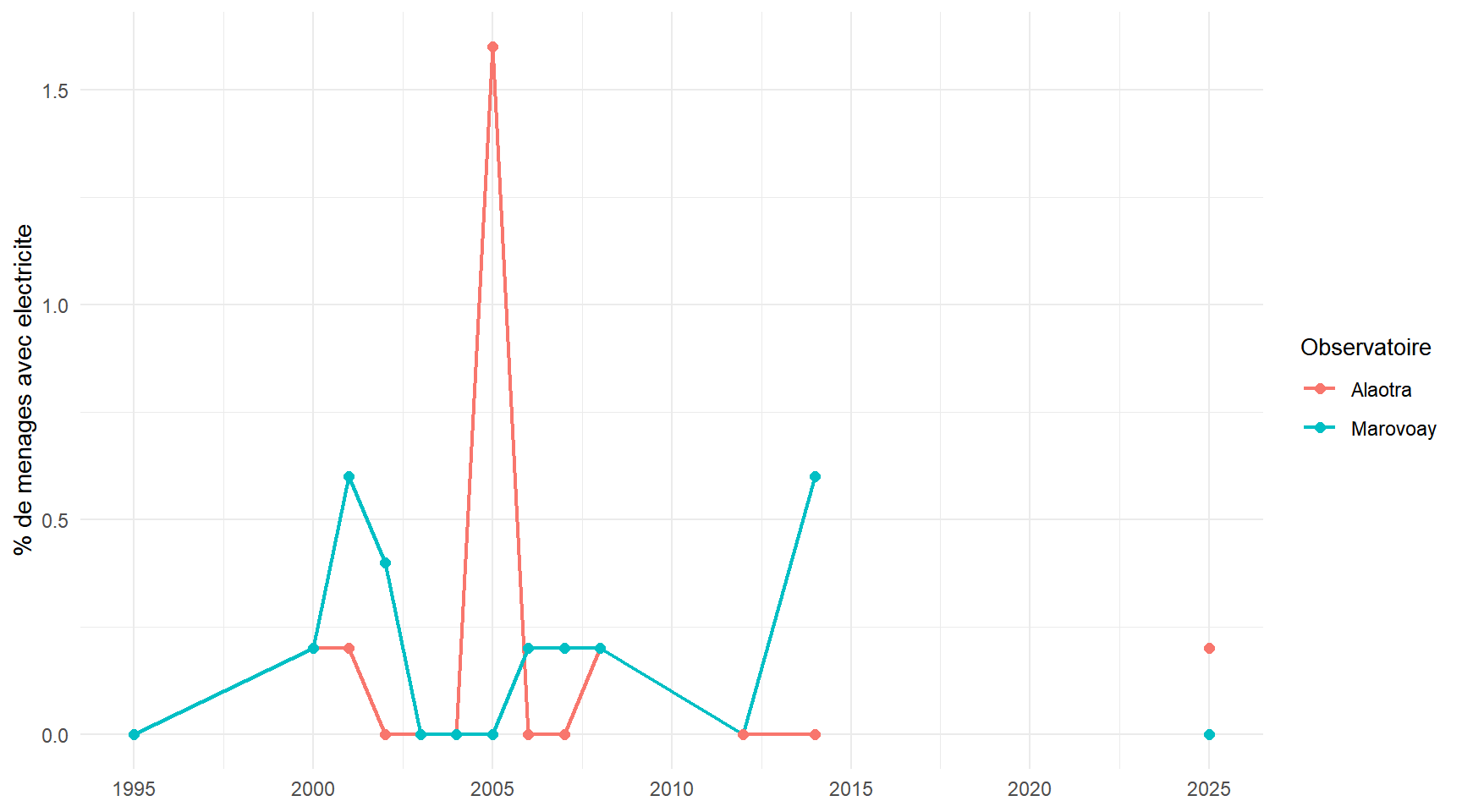 labs(x = NULL, y = "% de menages avec electricite", colour = "Observatoire") +