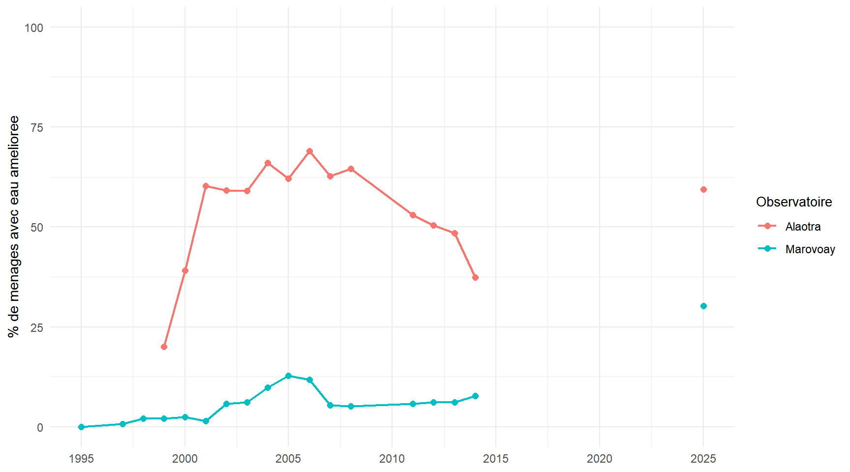 labs(x = NULL, y = "% de menages avec eau amelioree", colour = "Observatoire") +