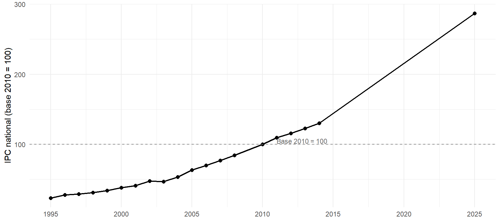 La comparaison des revenus sur longue periode necessite de tenir compte de l’inflation. Nous utilisons ici l’IPC national publie par la Banque Mondiale (indicateur FP.CPI.TOTL, base 2010 = 100). Cet indice est calcule a partir d’un panier de consommation urbain ; il ne reflete donc qu’imparfaitement l’evolution des prix en milieu rural. Pour 2024-2025, non encore publies par la Banque Mondiale, l’IPC est extrapole a +9 % par an.