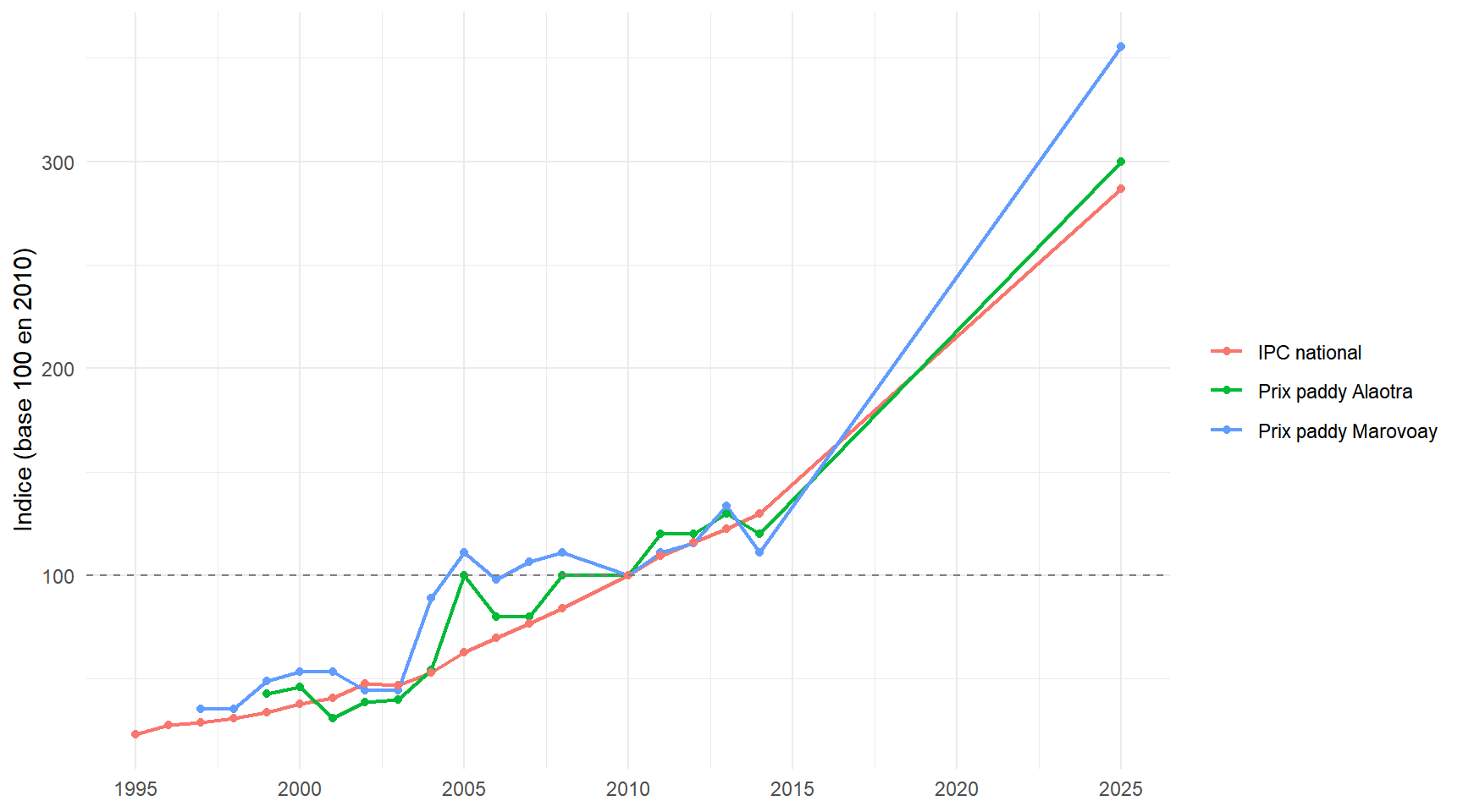 Une prochaine version de ce rapport integrera un IPC regional (Boeny pour Marovoay, Alaotra-Mangoro pour Alaotra), extrait des series de l’INSTAT ou des enquetes EPM, afin de mieux capter l’inflation locale.