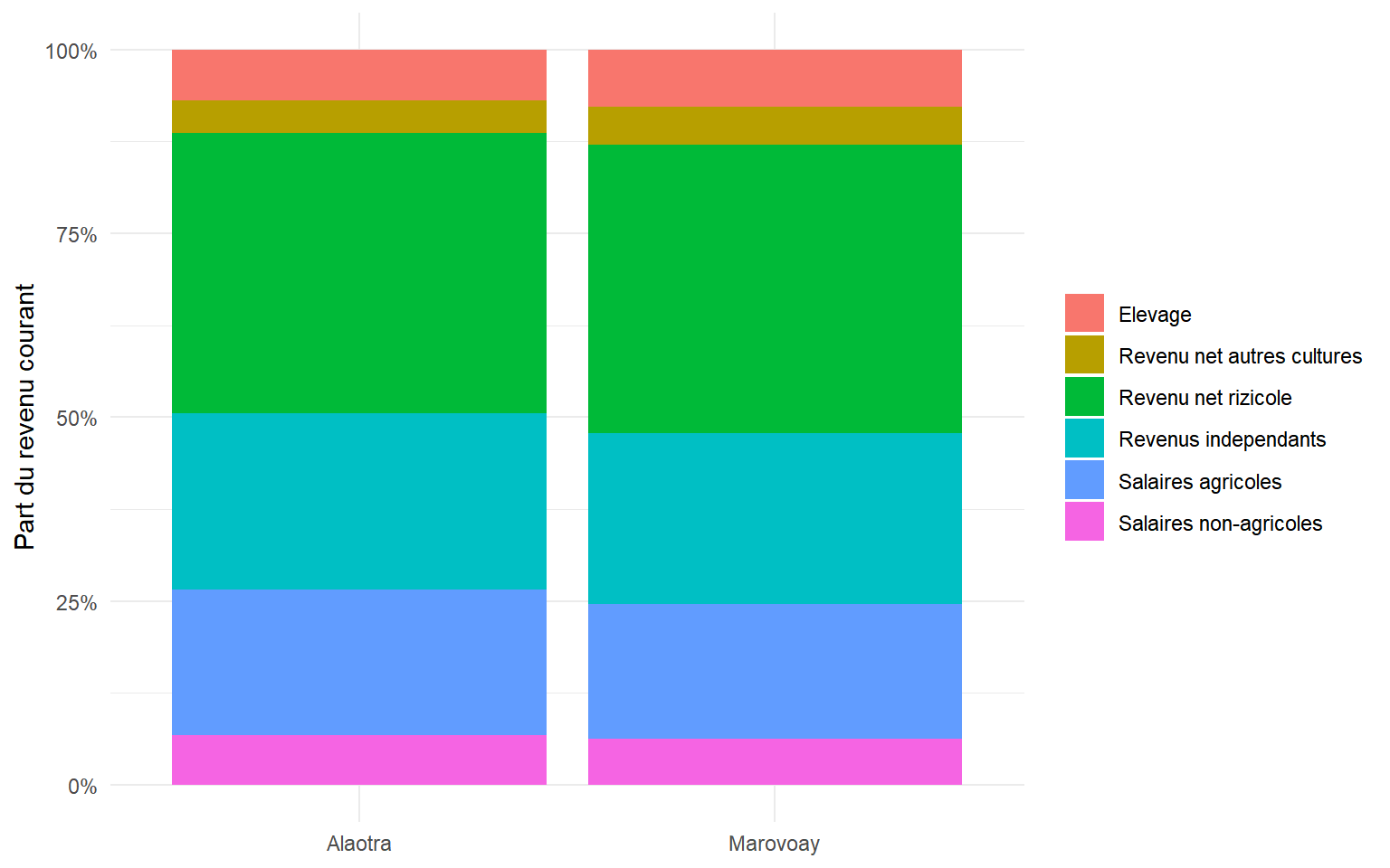revsec) : remuneration du travail salarie agricole ;revppal) : remuneration du travail salarie hors agriculture ;rev_indep) : revenus des activites liberales et artisanales non-agricoles ;rev_riz) : valeur de la production de riz moins les charges ;rev_cu) : meme logique pour les cultures non-rizicoles ;revel) : ventes d’animaux et produits d’elevage ;revpeche).Le revenu exceptionnel regroupe les rentes foncieres, les autres revenus, le travail HIMO, la decapitalisation et les transferts recus.