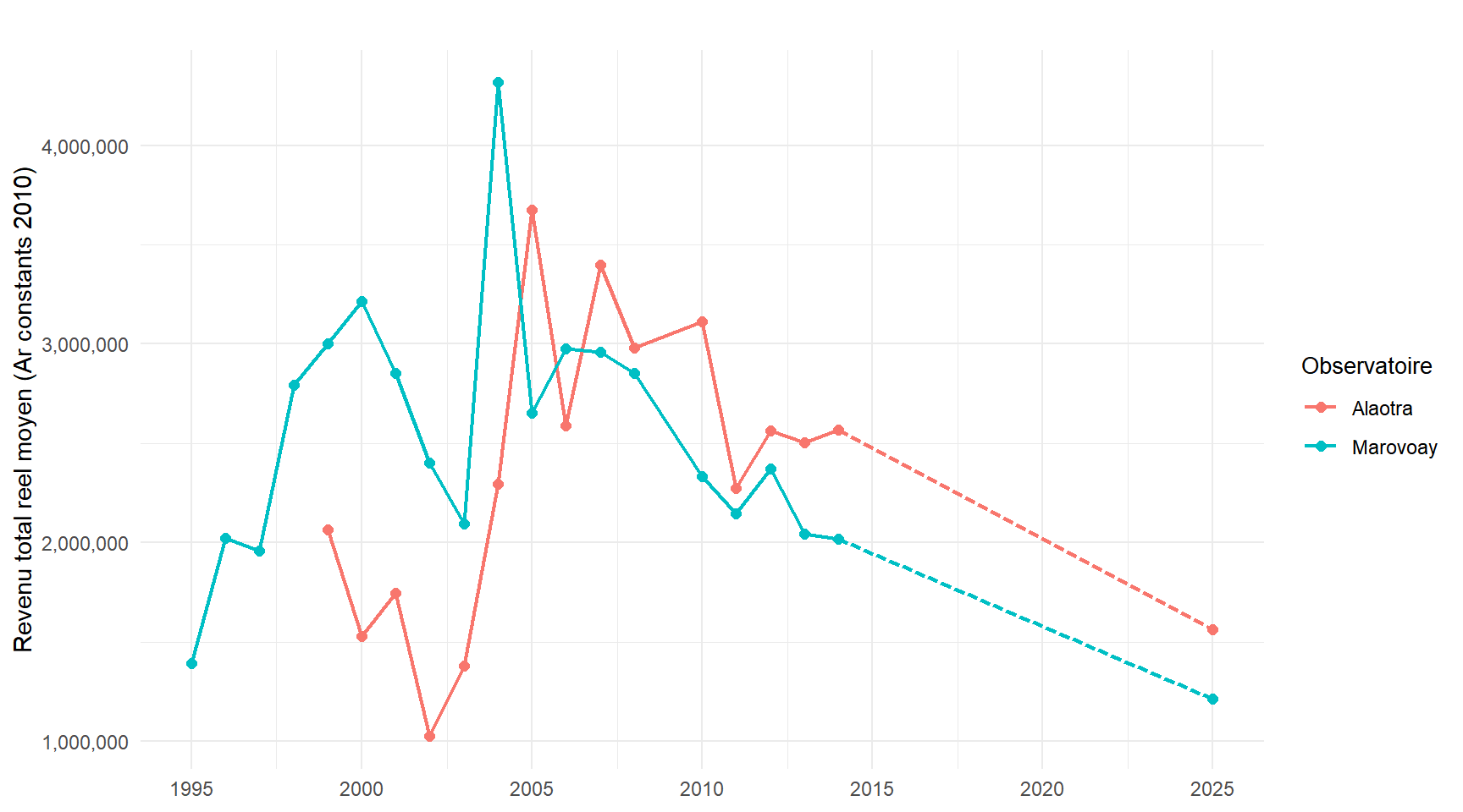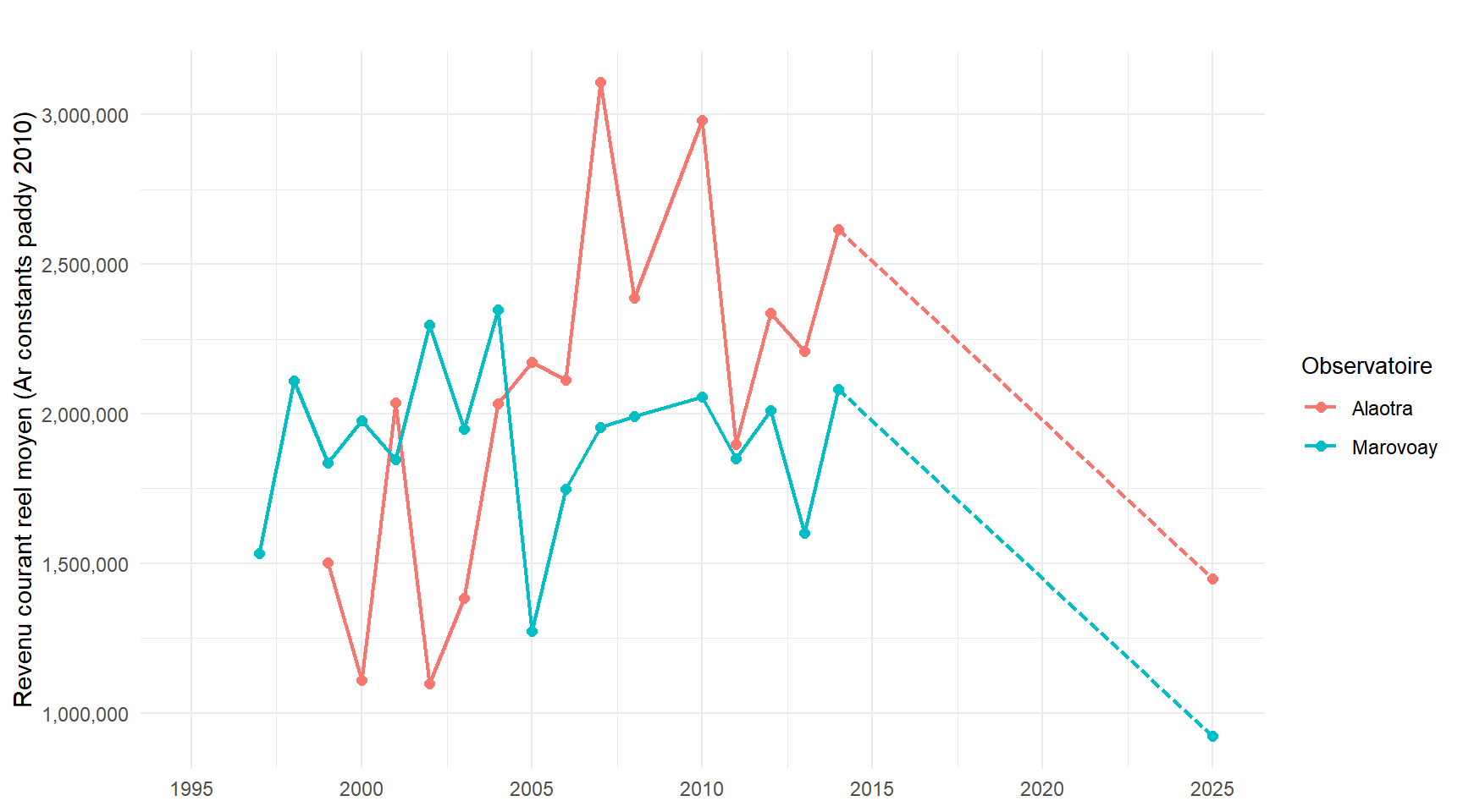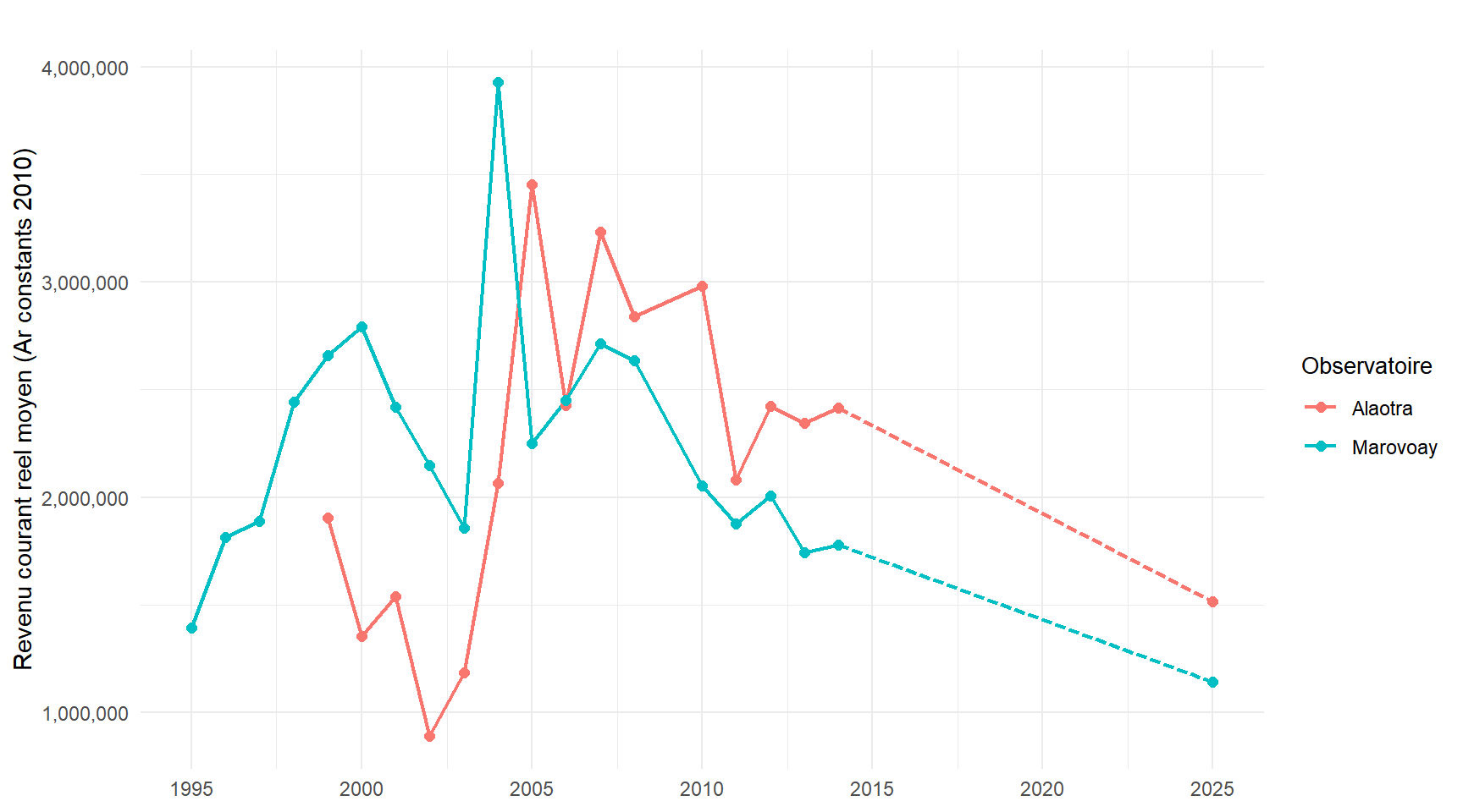 Les observatoires de Marovoay et d’Alaotra disposent de series longues permettant de suivre l’evolution des revenus sur trois decennies. Les donnees couvrent 1995-2008 et 2010-2014 pour Marovoay, 1999-2008 et 2010-2014 pour Alaotra, ainsi que la campagne 2025 pour les deux. Les annees 2009 et 2015-2024 ne contiennent pas ces observatoires. Le trait pointille materialise l’absence de donnees.