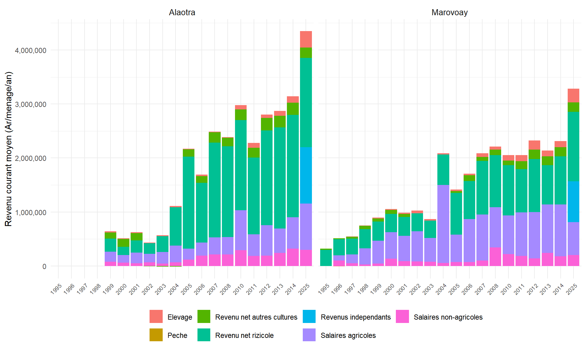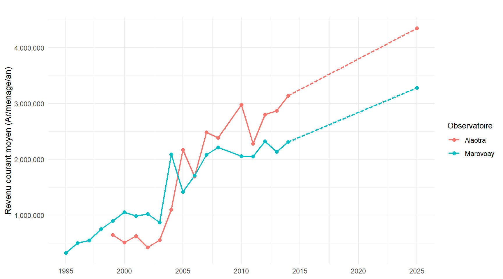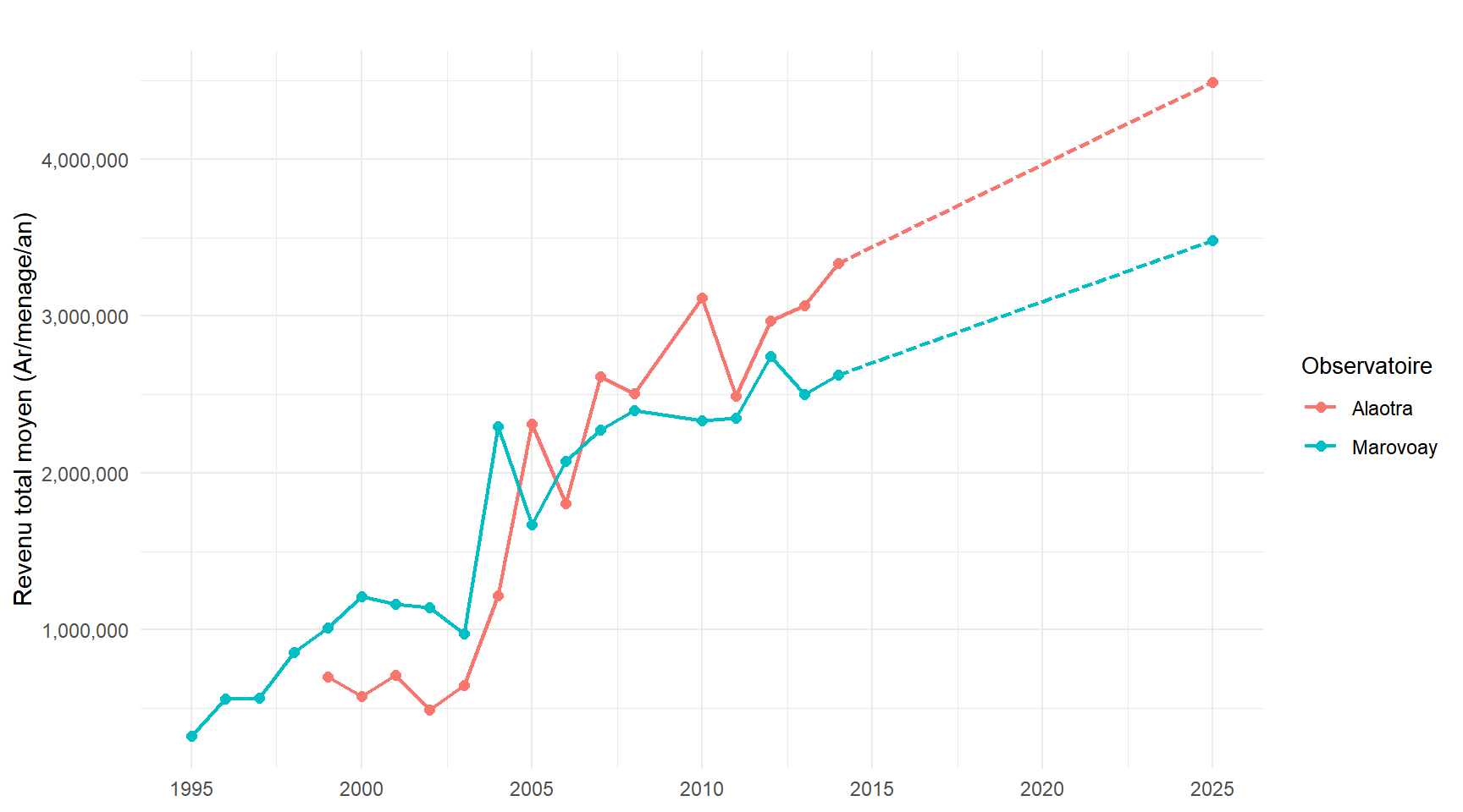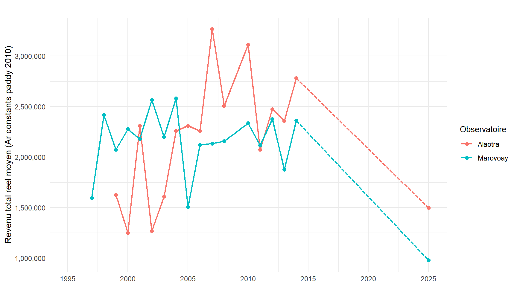 Les observatoires de Marovoay et d’Alaotra disposent de series longues permettant de suivre l’evolution des revenus sur trois decennies. Les donnees couvrent 1995-2008 et 2010-2014 pour Marovoay, 1999-2008 et 2010-2014 pour Alaotra, ainsi que la campagne 2025 pour les deux. Les annees 2009 et 2015-2024 ne contiennent pas ces observatoires. Le trait pointille materialise l’absence de donnees.
