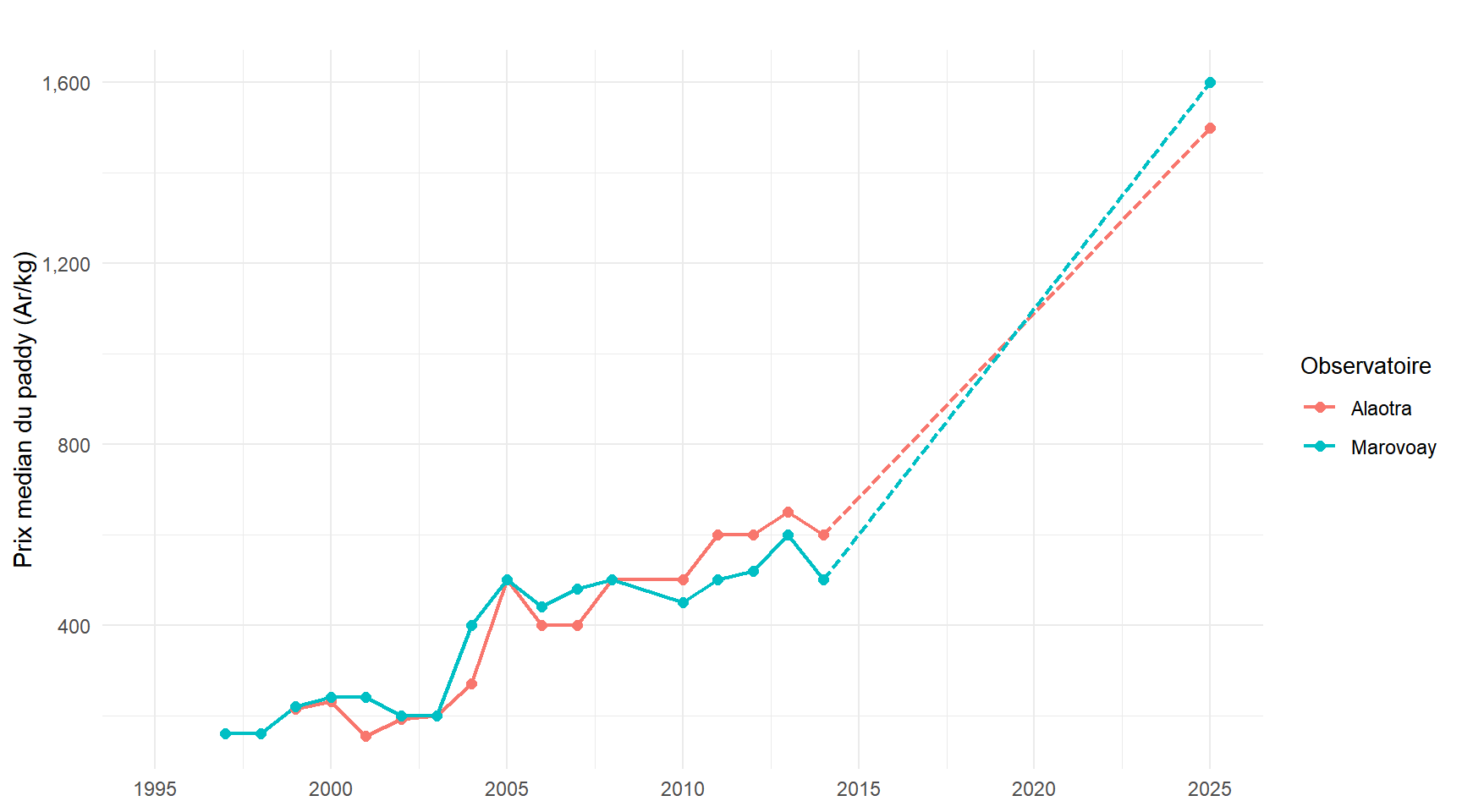 trends |> make_trend_plot(prix_paddy_median, "Prix median du paddy (Ar/kg)")