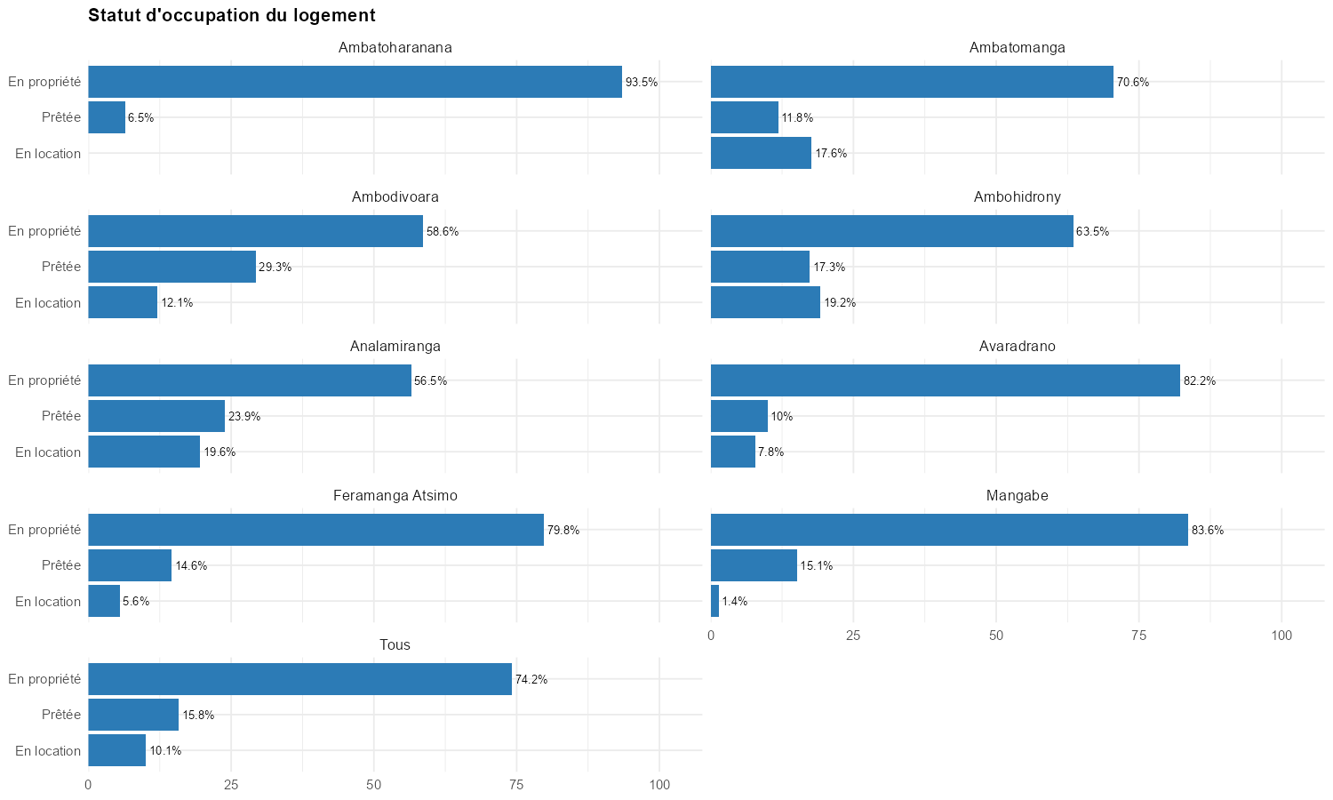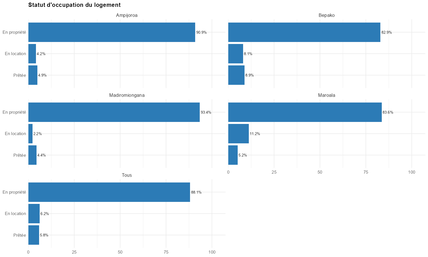 Les conditions d’habitat des ménages enquêtés témoignent des réalités du milieu rural malgache. Le statut d’occupation, le type d’assainissement, l’accès à l’eau, le mode d’éclairage et la source d’énergie de cuisson constituent des indicateurs essentiels du cadre de vie.