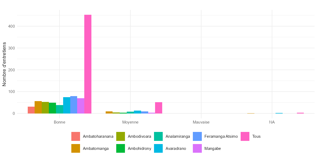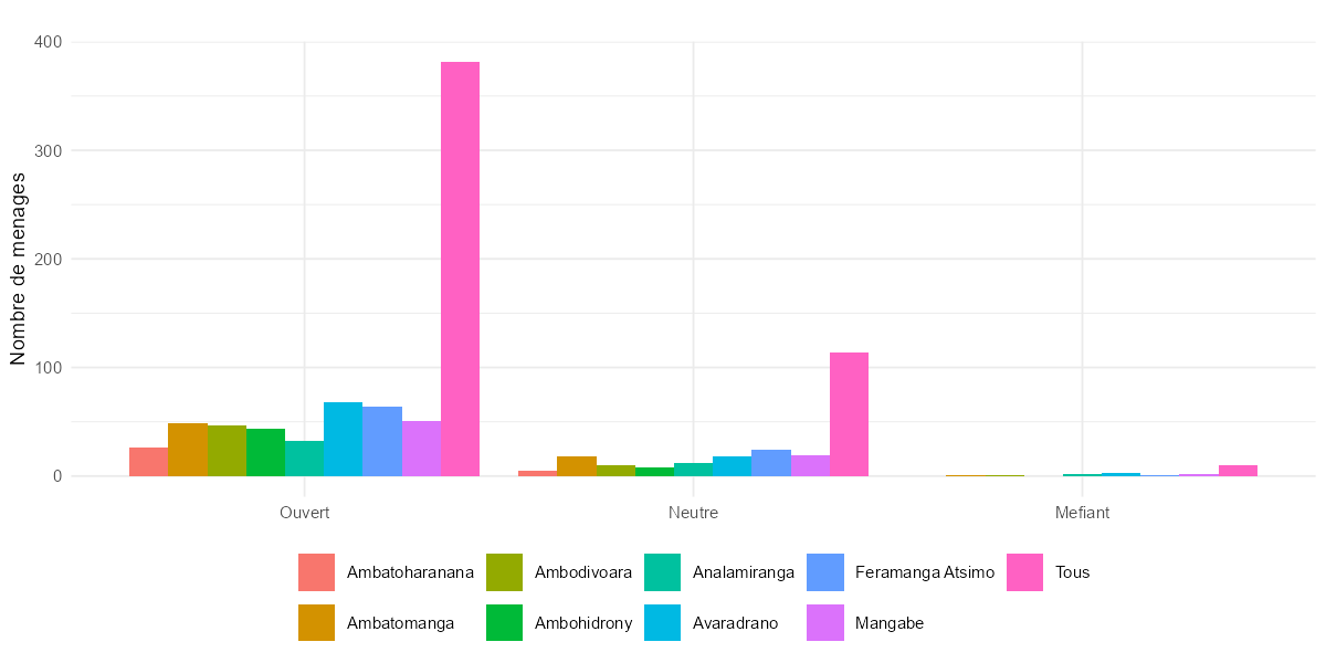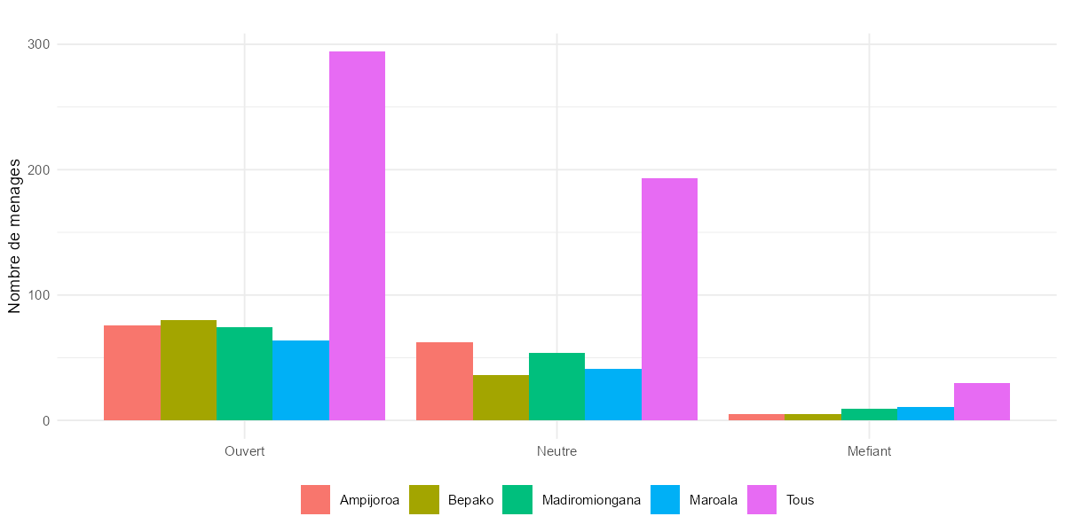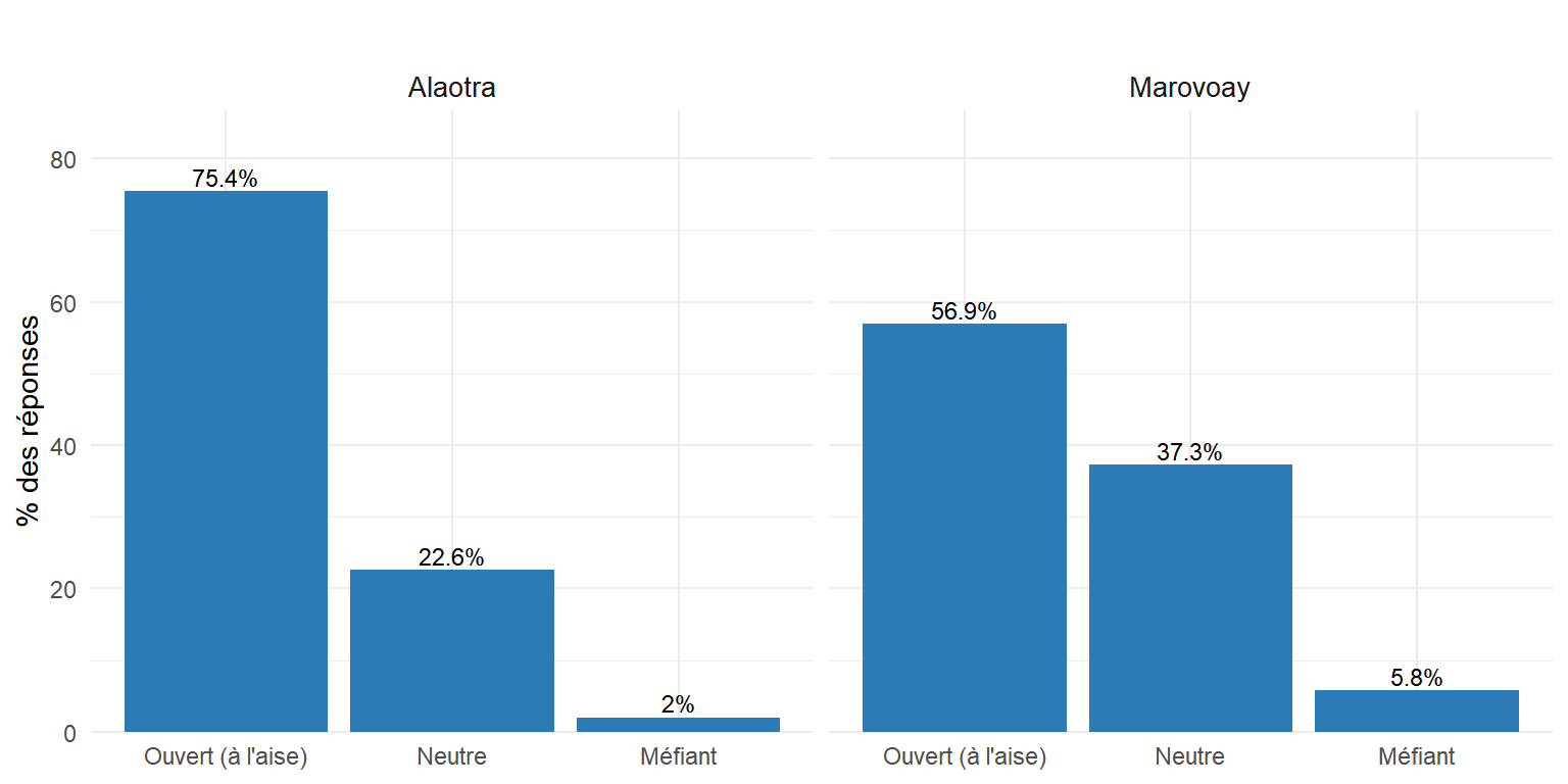 qual2aa = 4 (1 observation, Alaotra) — Le code 4 n’existe pas dans la grille (1 = Ouvert, 2 = Neutre, 3 = Méfiant). qual1aa vaut 1 (Bonne) et la remarque est vide. Il s’agit d’une erreur de saisie isolée. Action recommandée : recoder en NA.
