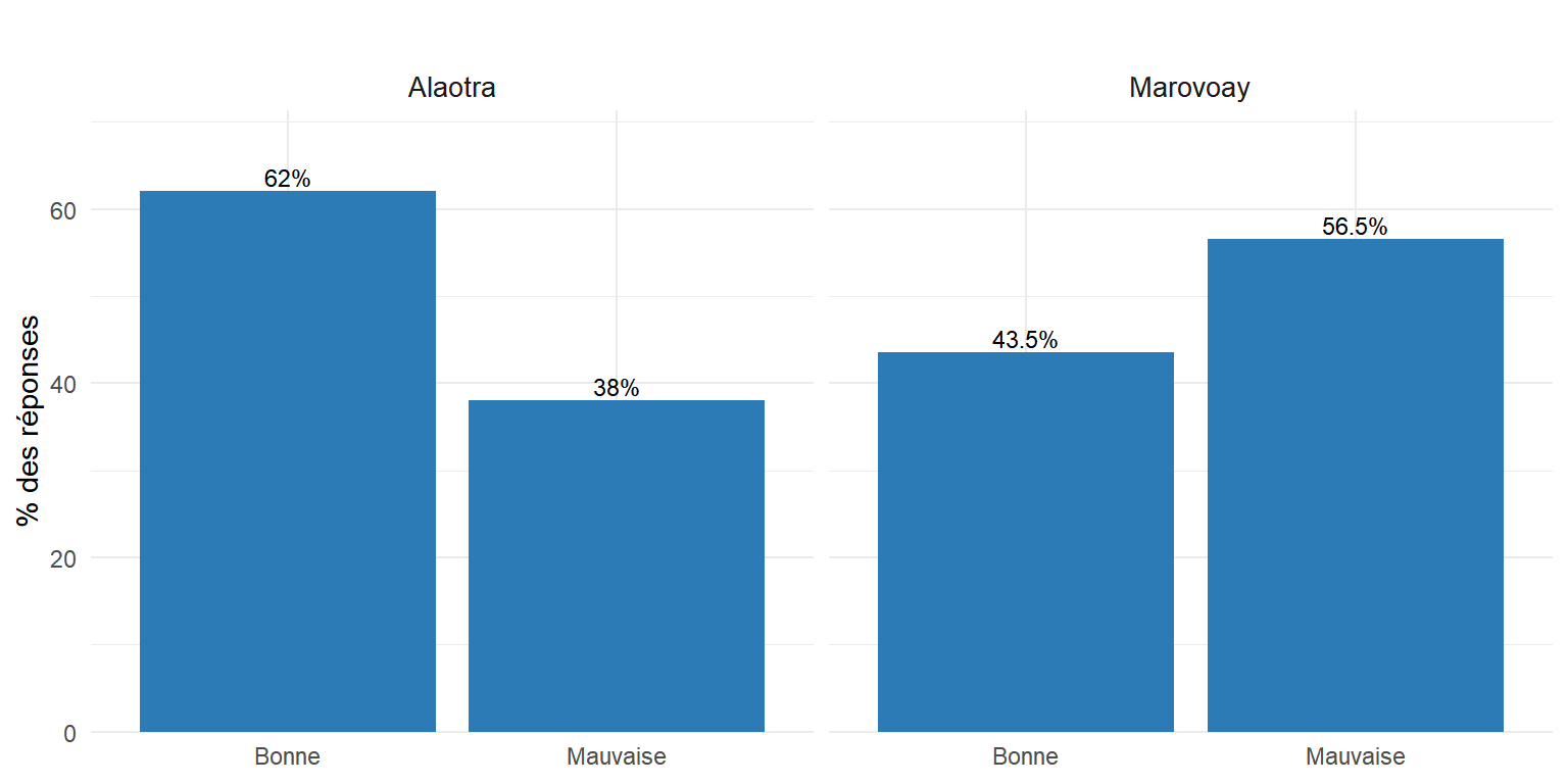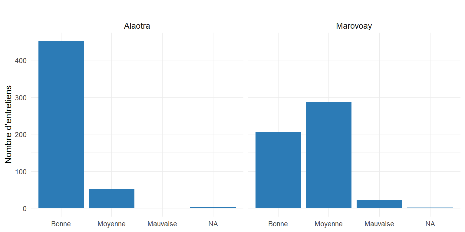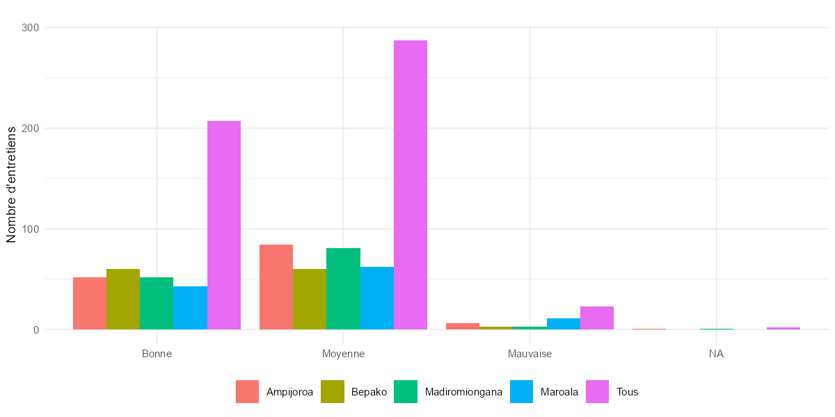 qual2aa = 4 (1 observation, Alaotra) — Le code 4 n’existe pas dans la grille (1 = Ouvert, 2 = Neutre, 3 = Méfiant). qual1aa vaut 1 (Bonne) et la remarque est vide. Il s’agit d’une erreur de saisie isolée. Action recommandée : recoder en NA.