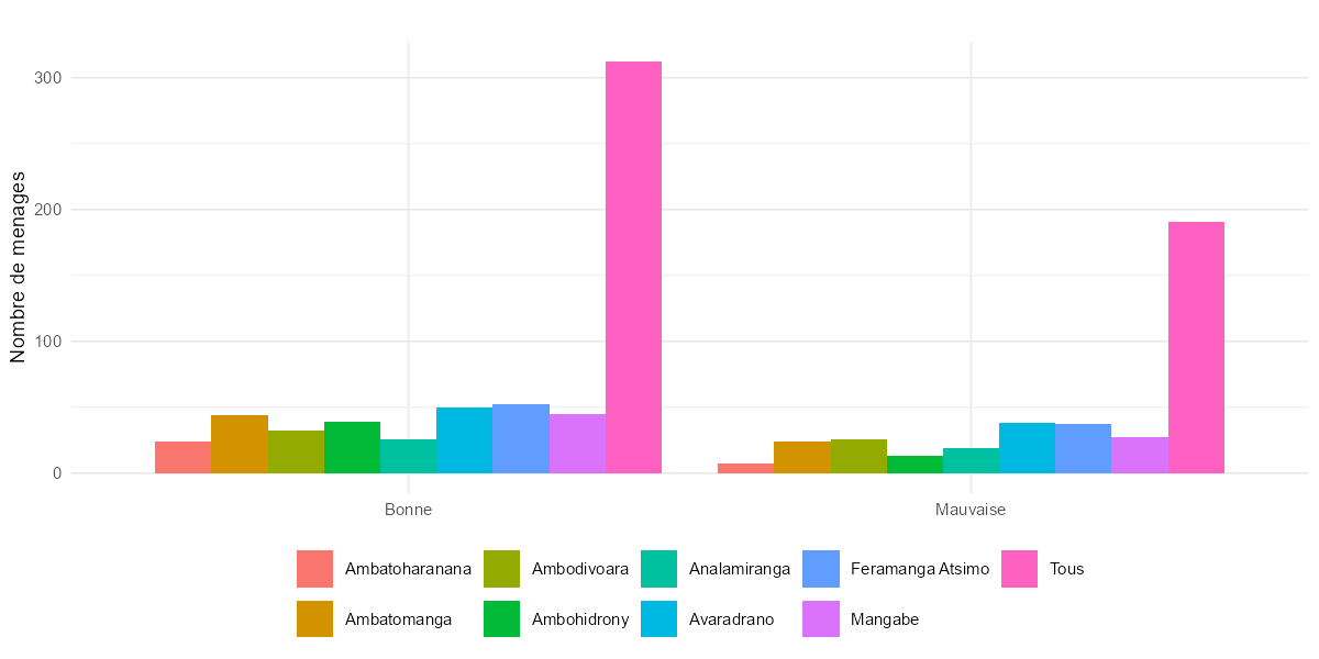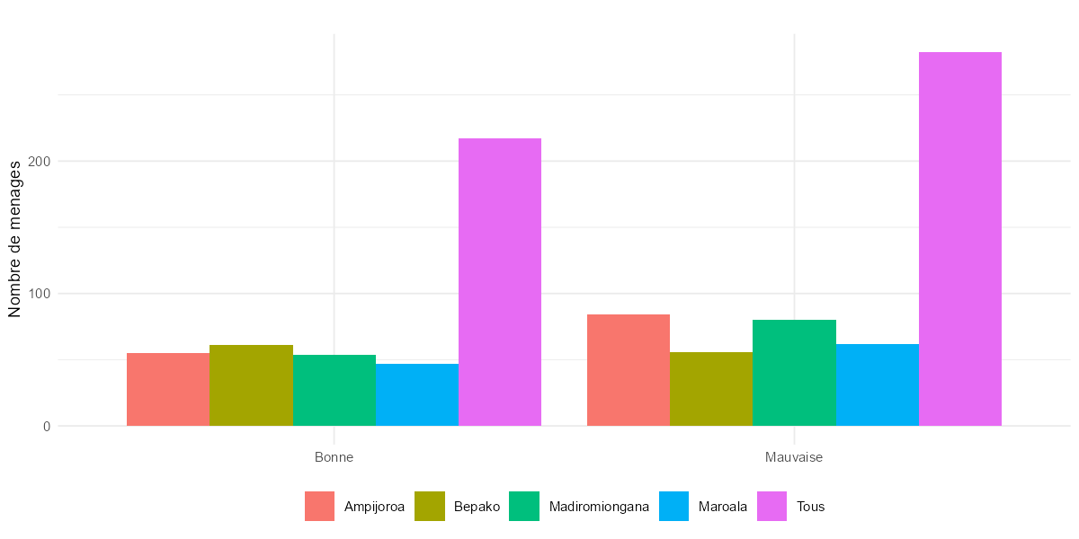 Valeurs manquantes : 3 ménages ont qual1aa et qual2aa à NA. Ces cas sont à vérifier auprès de l’équipe de saisie.