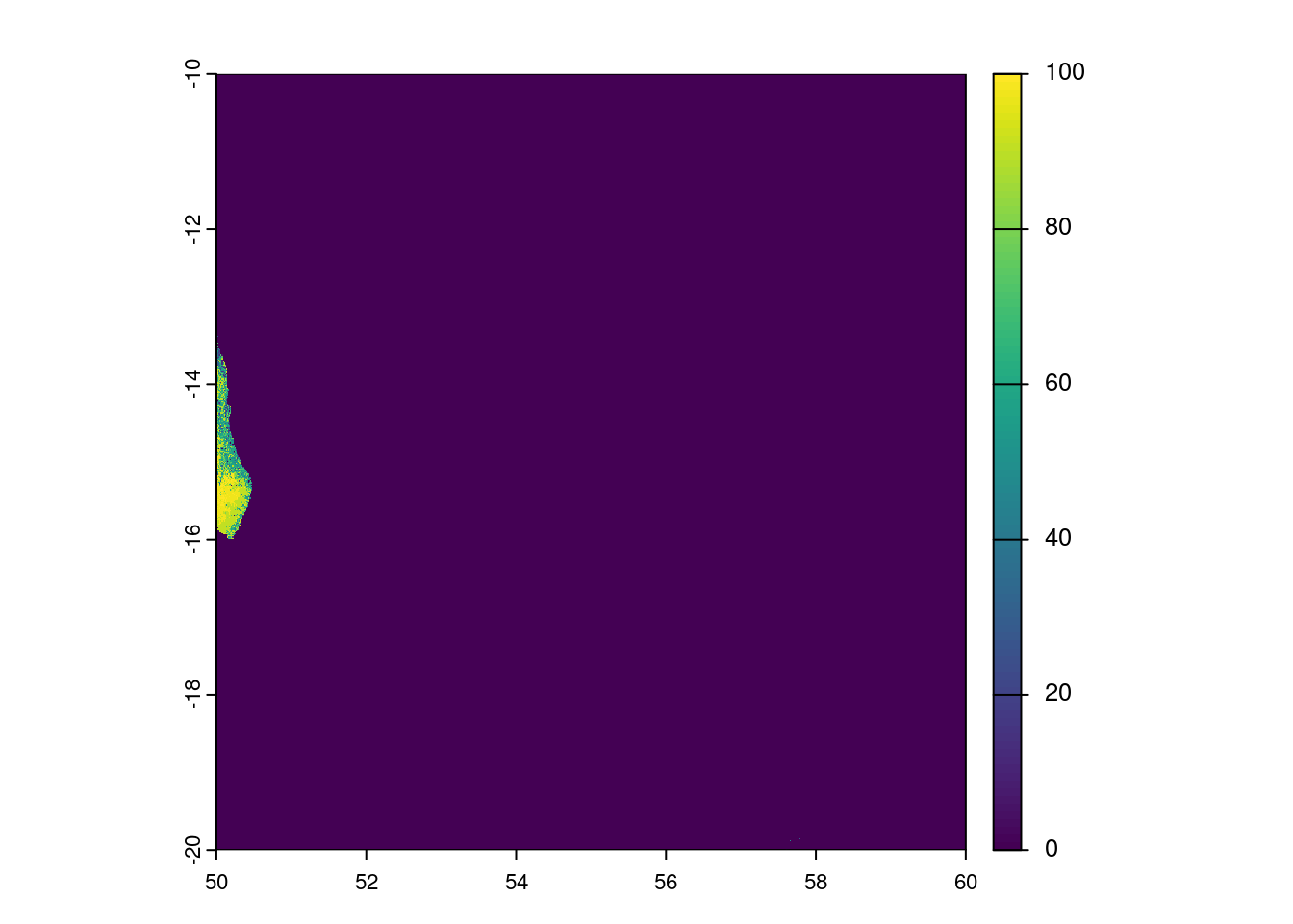 # Charger la tuile rastergfc_raster <-rast("data/Hansen_GFC-2023-v1.11_treecover2000_10S_050E.tif")plot(gfc_raster)