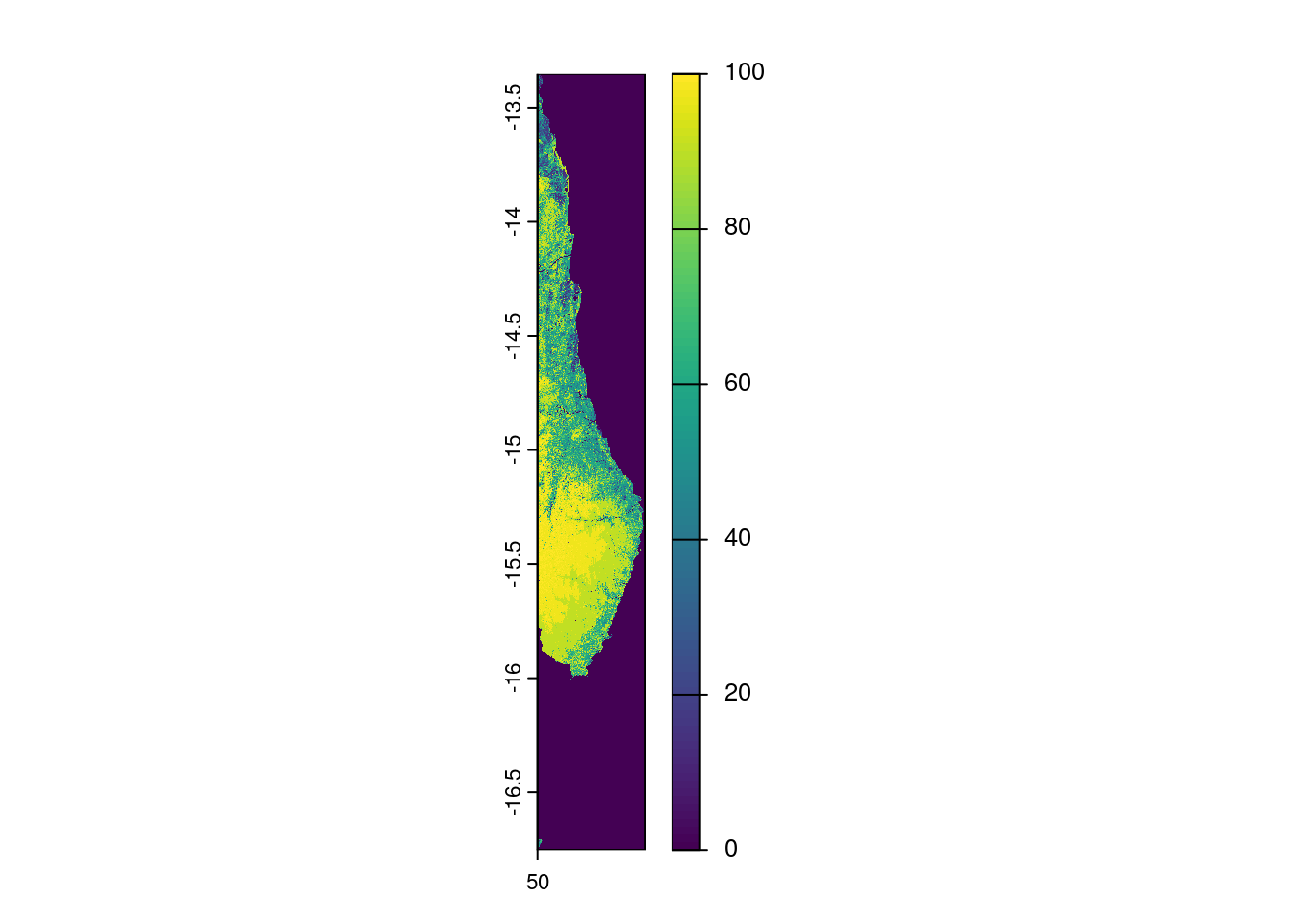 # Extraire la bounding box du raster en tant que SpatVectorraster_bbox <-as.polygons(ext(gfc_raster), crs =crs(gfc_raster)) %>%st_as_sf()# Calculer l'intersection entre la bbox du raster et gadm_mada0intersection <-st_intersection(raster_bbox, gadm_mada0)# Réduire l'étendue du raster avec crop() en utilisant l'emprise de Madagascargfc_raster_crop <-crop(gfc_raster, intersection)plot(gfc_raster_crop)